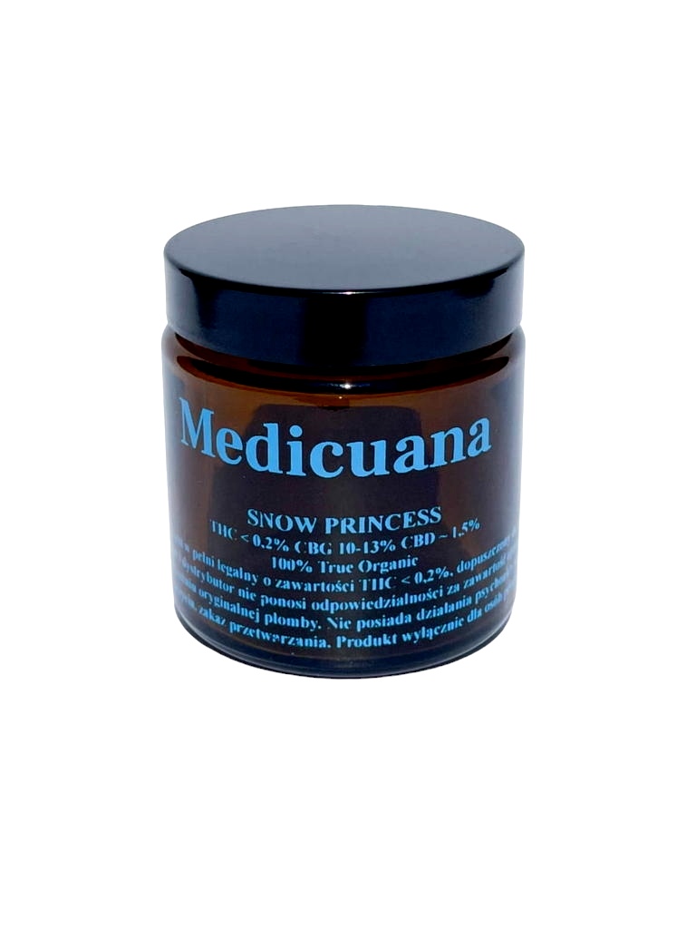 Snow Princess zawiera CBG 10% - 13% | CBD ~1,5%, znana także jako “Snowka”, to pierwszy starannie wyselekcjonowany produkt Medicuana (susz klasy premium). Zdobywa uznanie nawet wśród najbardziej wymagających koneserów dzięki unikalnemu połączeniu aromatów i smaków (subtelny aromat kwiatów).